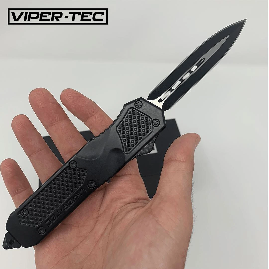 Like all Viper Tec knives, the Venom VT-1 is built for hard use. Each Knife comes with a 3.5-inch 440c blade that have been hand sharpened to an extremely sharp edge ready to cut right out of the box. The smooth ergonomic handles are made of high-quality Zinc Alloy. The button placement along the spine of the handle allows for lighting fast ambidextrous openings right from the operators pocket. The Venom VT-1 also allows for right and left-hand users to pocket carry with its stainless steel reversible pocket clip. If that wasn’t enough the Venom VT-1 knife also comes equipped with a “battle tested” glass breaker pommel.