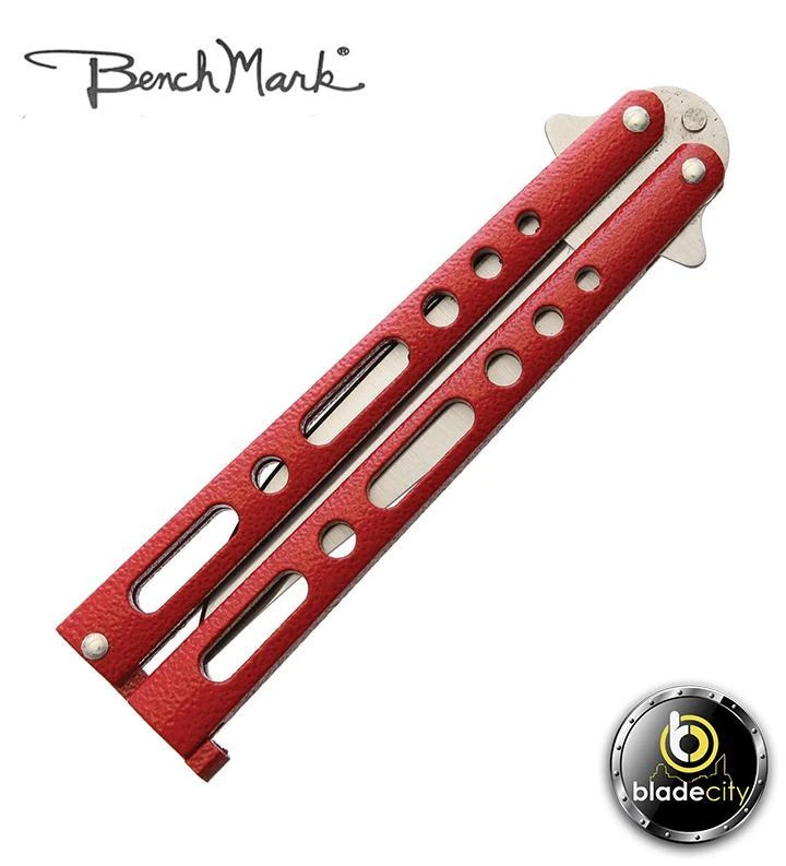 The large Benchmark Red Butterfly knife has a clip point style stainless steel blade with a satin finish. The handles are made from cast metal with visually appealing cutouts, and feature channel construction with pins. This is a great butterfly knife priced for anyone looking to get into the hobby.
