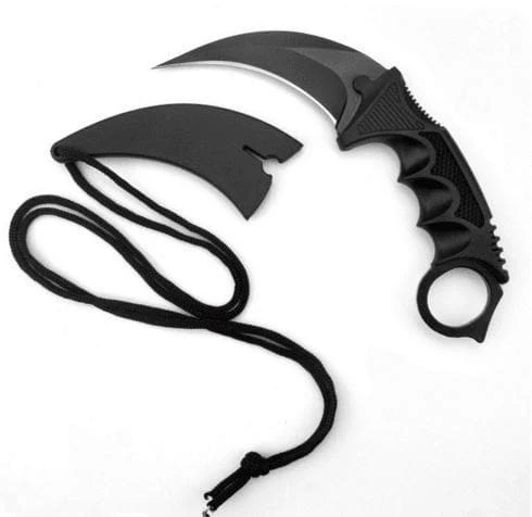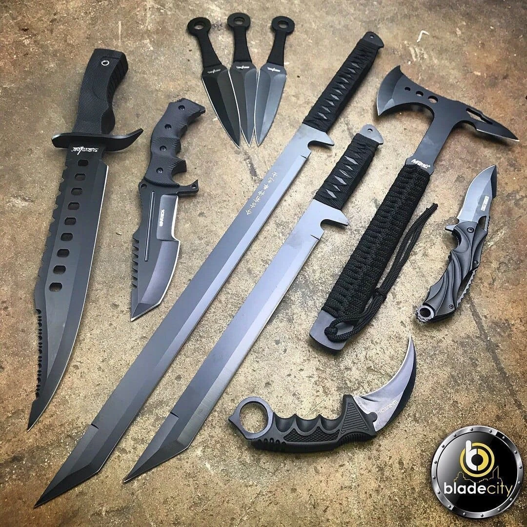 Comes with Tomahawk Axe, Karambit, Huntsmen Bowie, Spring assisted Knife, 3 piece throwing knife set, Twin Ninja Swords.