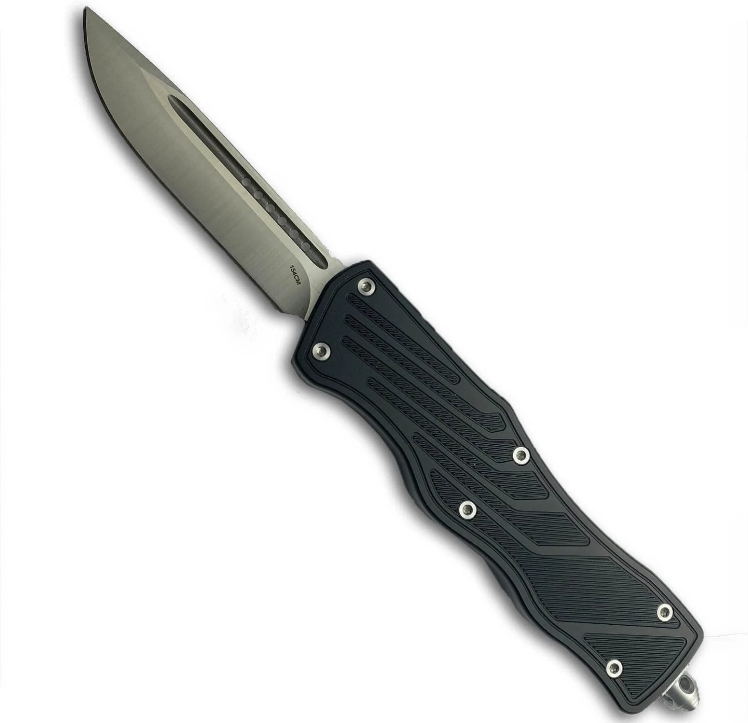 The Hendrix Gear X Lite is a heavy duty, serious business OTF knife. It features an aluminum handle with a secure grip. The sturdy blade is made from 154cm and pops out quickly and reliably. It includes a reversible deep-carry pocket clip.