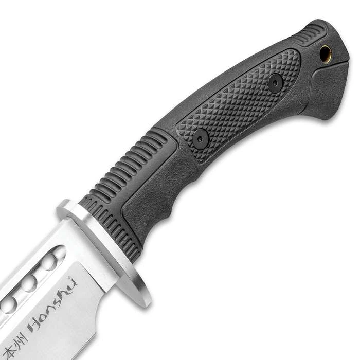 The Honshu Boshin Toothpick Knife is an exceptional addition to the Boshin line of tactical weapons, which blends tradition and innovation and style and function. The 12” blade has a rock-solid, full-tang 7Cr13 stainless steel construction with a unique flat taper grind and it features weight-reducing thru-holes. The textured, ergonomically contoured TPR handle is secured to the tang with heavy-duty screws and the ridges provide a secure, no-slip grip. The tactical toothpick is 18 3/4” in overall length and it comes housed in a premium, reinforced genuine leather belt sheath, which features a paracord lanyard for lashing. Like all the swords and knives in Honshu’s Boshin line, the Boshin Toothpick Knife sets a new standard for both quality and value.