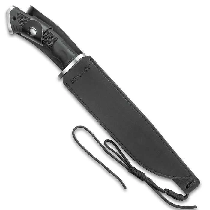 - The 16 1/2” overall bowie knife fits like a glove in its reinforced leather belt sheath that also features a lanyard cord