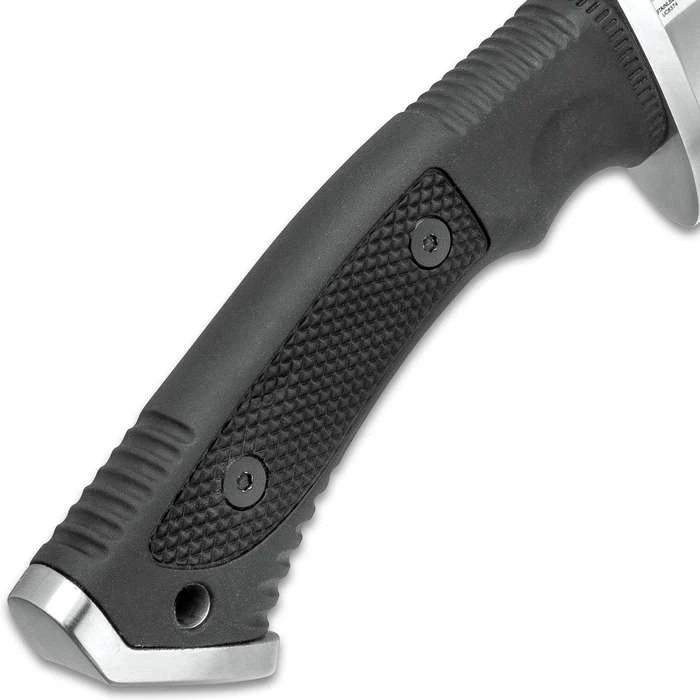 The Conqueror Bowie Knife is an exceptional addition to Honshu’s rock solid tactical weapon line. Always innovative and always at the forefront of the industry, United Cutlery’s blades are meant for real world use so, their construction has a strength and quality that cannot be matched! This bowie knife has a 10 7/8” 7Cr13 stainless steel blade with a phenomenally sharp edge and double blood grooves. The hefty stainless steel guard in front of the grippy handle provides a slight buffer from your hand and the blade. The ergonomic TPR injection handle has grid-texture on both sides and ridging so that you’re guaranteed a secure grip, plus, a brass lanyard hole offers another carry option. The 16 1/2” overall bowie knife fits like a glove in its reinforced leather belt sheath that also features a lanyard cord.