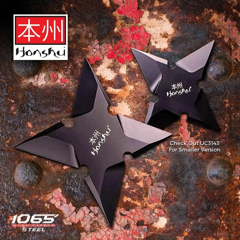 By popular demand, Honshu has crafted a larger version of its signature Sleek Black Throwing Star! This 7” diameter throwing star is a perfectly balanced piece with the same sleek and modern feel as the original. It is constructed of 1065 high carbon steel with a black oxide coating and comes with a sturdy nylon sheath with a belt loop. Razor sharp and rock solid is the Honshu legacy. Trust no one else!