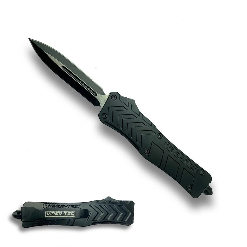 The VF-1 Double Action Out The Front Knife features a 440c Stainless Steel blade. The blade can be quickly deployed with the ambidextrous sliding button. Pushing forward on the button deploys the blade out the front of the handle and pressing backwards on the button retracts the blade back into the handle where it is ready again to be deployed at a moments notice. The 2.5″ blade comes standard with an aggressive partially serrated edge giving you tearing and cutting power making it a great all purpose blade. The blade is exceptional at both piercing and slicing due to its shape. The handle is patterned for non-slip handling in any environment. The metal pocket clip is reversible and can be carried in the button back or button front positions. When clipped into the pocket it has a nice low profile “ride”. The end of the knife features a glass breaker pommel designed to shatter glass or break anything else you might need to in case of an emergency.