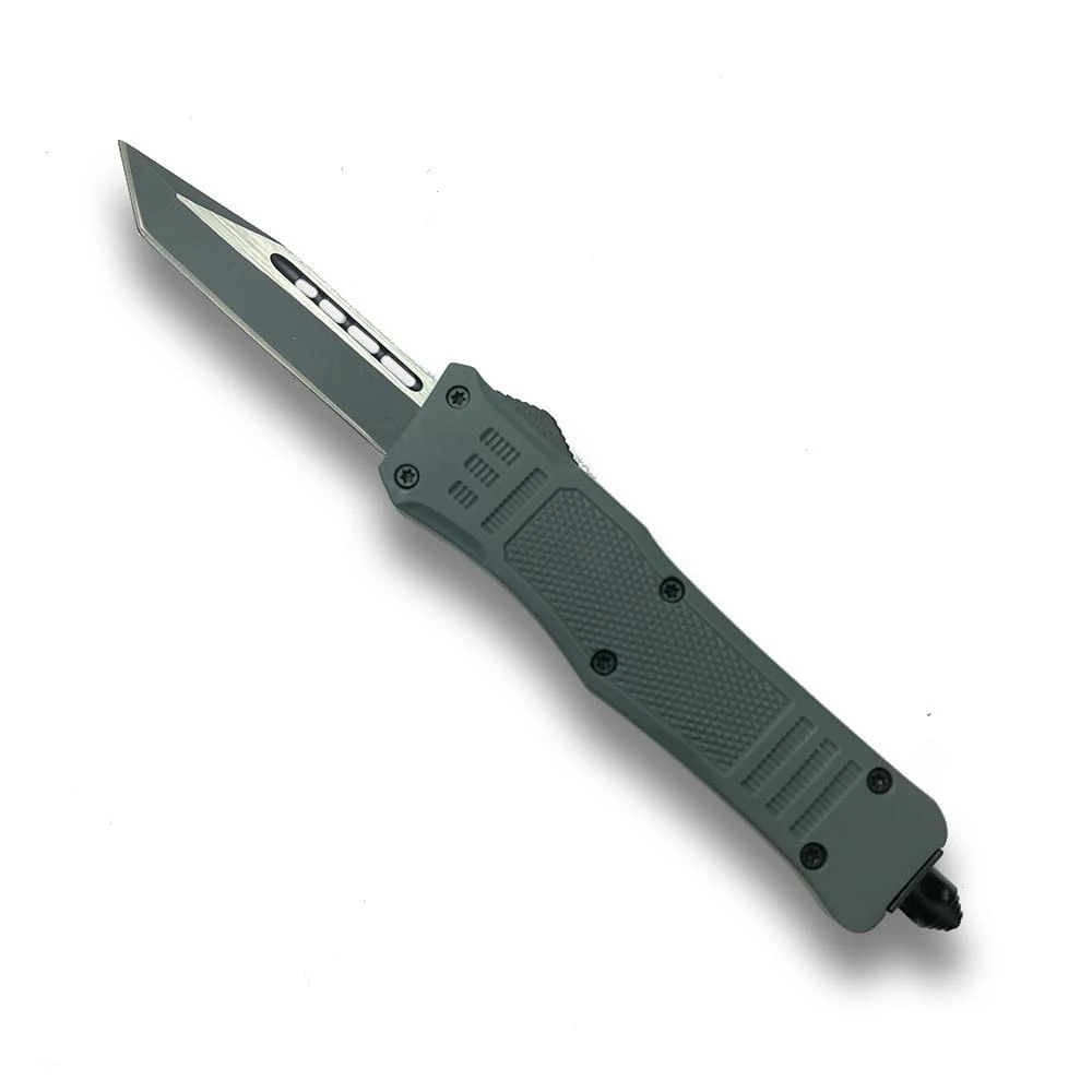 The Mini Mini Phantom tactical double action out the front knives feature a 440c stainless steel blade with a two tone black and silver finish. The blade can be quickly deployed with the ambidextrous sliding button. Pushing forward on the button deploys the blade out the front of the handle and pulling backwards on the button retracts the blade back into the handle where it awaits to be deployed again in a moments notice. Our 2.75 inch blades comes with a tanto edge. The Zinc-Aluminum handle is comes with a patterned grip for slip resistant handling in any environment. The metal pocket clip is reversible making our knife ambidextrous. When clipped into your pocket our knife is so slim it easily becomes neatly concealed. The end of our knife features a tactical glass breaking tailcap designed to shatter glass in case of an emergency.  All Viper Tec OTF knives are extremely safe to operate and use.