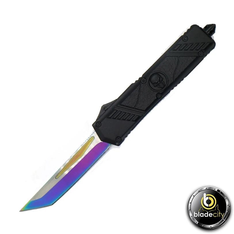 The Skull Series Automatic Out The Front OTF knife. High Quality all metal construction, heavy duty spring snaps blade open and closed. All Black handle an screw heads for maximum concealment.