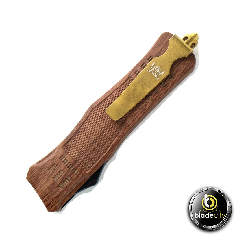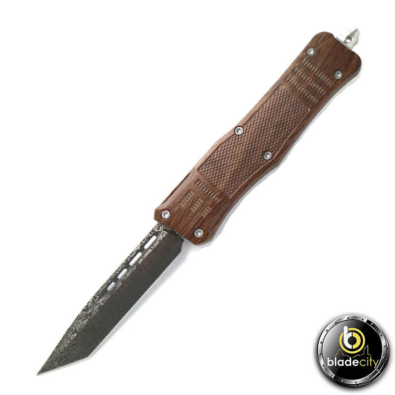 The Wood Series Double Action Out The Front Knife features a damascus etched 440c Stainless Steel blade. The blade can be quickly deployed with the ambidextrous sliding button. Pushing forward on the button deploys the blade out the front of the handle and pressing backwards on the button retracts the blade back into the handle where it is ready again to be deployed at a moments notice. The 3.9″ blade comes standard with an aggressive tanto edge giving you cutting power making it a great all purpose blade. The blade is exceptional at both piercing and slicing due to its shape. The handle is patterned for non-slip handling in any environment. The metal pocket clip is reversible and can be carried in the button back or button front positions. When clipped into the pocket it has a nice low profile “ride”. The end of the knife features a glass breaker pommel designed to shatter glass or break anything else you might need to in case of an emergency.